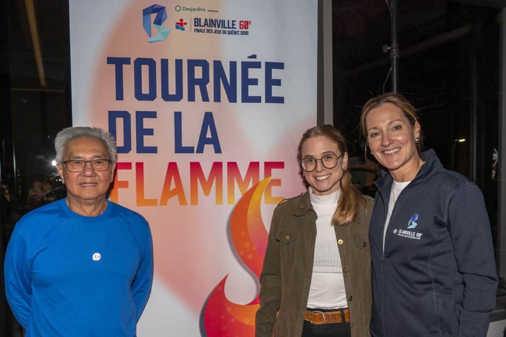 Pour lancer la Tournée de la flamme : la mairesse Liza Poulin (à droite) entourée de l’olympienne Cendrine Browne (au centre) et de Dang Thanh Bui (à gauche), bénévole engagé qui compte à son actif près de 30 Finales des Jeux du Québec.