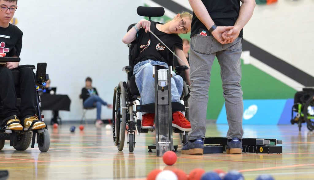 Mia Dufour, athlète de boccia, en plein match.