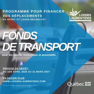 Le Fonds de transport de Loisirs Laurentides provient d’un programme du Gouvernement du Québec dont le but est de faciliter la participation aux activités sportives et récréatives (plein air, loisir culturel et artistique, loisir récréatif et loisir actif) au Québec en remboursant, sous certaines conditions, une partie des frais liés au transport (frais de déplacement) des équipes, clubs, organismes et/ou individus demandeurs.